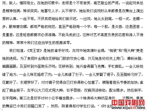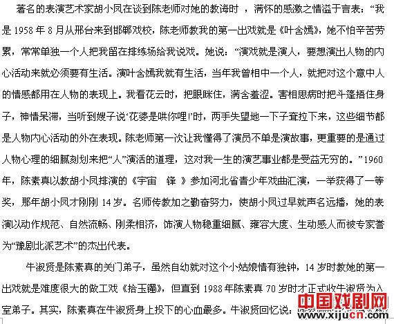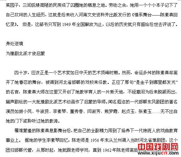 时光荏苒,陈素真先生离开我们已近十五个年头了,今年是她诞辰九十周年,为了缅怀先生一生对中国豫剧艺术的杰出贡献,追思她从1956至1962年在邯郸工作、生活的七年中从艺、做人高洁的师表风范,我们邯郸市地方文化研究会怀着对艺术大师的无限敬仰之情,特邀请了当年陈先生的学生胡小凤、牛淑贤、李素琴,还有伴随陈先生多年的琴师、板胡演奏家刘纯朴先生以及被她视为患难知己的学生谢春云女士等人茗边长谈,大家共同追溯这位艺术大师的苦乐人生,并感念她将豫剧由低俗的村野小戏洗拔、升华,使之登上都市大雅之堂的改革历程,以及她对邯郸豫剧事业的发展、繁荣所做出的不朽建树。虽斯人已逝,但她给我们留下的博大精深的艺术遗产,不卑不亢不媚不俗高尚的人格魅力,令我后生晚辈常怀“高山仰止,景行行止”的钦敬之情。