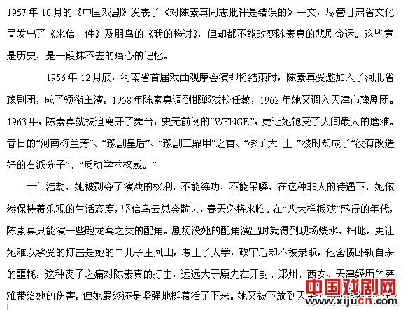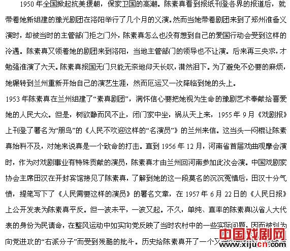 有道是“木秀于林,风必摧之;堆出于岸,流必湍之。” 陈素真天生了一副傲骨,不卑、不亢、不媚、不俗,宁为玉碎,不为瓦全,这就注定了她必然是一位悲剧式的人物。她的大半生几乎都是在逆境中艰难跋涉,始终处于高处不胜寒的境地。1948年冬开封解放,全民欢庆,而陈素真却成了戏剧界第一个倒霉的人。开封成立了工会,工会把她划为资产阶级剥削者,给戴上了“戏霸”的大帽子。可怜,从小没读过书的陈素真却连这些词是个什么意思都不懂。