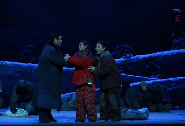 “黄河古道沙漫漫,内涝洼窝侵良田。盐碱地白茫茫枯草片片,问兰考为什么灾荒年年”序幕里焦裕禄苦苦探寻,满心忧虑的身影伴着悠扬又带着激昂的旋律很快就把我们带入了剧情之中。风雪天,焦裕禄的声声对不起,一下子就拉进了与观众的心理距离,一个可亲可敬的形象走进了我们的心里。