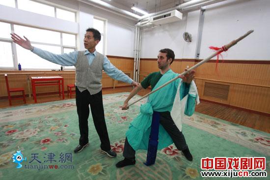 看见卡洛斯的时候,他正在和京剧老师一边练武戏一边念戏里的对白,要是蒙着眼睛不看他那灰眼睛白皮肤,只听声音,你会认为他根本就是一个土生土长的中国人,因为他的中文实在了得,京剧对白字正腔圆。他正在练习的是京剧《水浒传》,在里面他唱花脸,扮演得是赤发鬼刘唐。