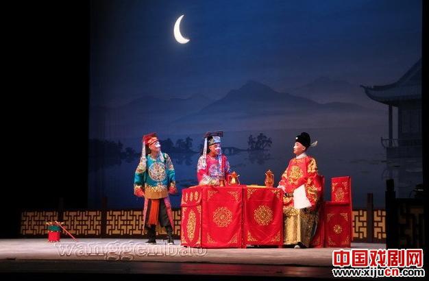 二是第三折戏的故事发生在中秋佳节。八月中秋月儿圆,但这场演出的天幕上却高高地悬挂着一弯下弦月,十分醒目。剧中人谭记儿、杨衙内口口声声说今晚是中秋夜,要饮酒赏月,但天幕上的下弦月却亮亮地挂在那里,这个有悖常规、有违常识的弯弯的中秋月,岂不滑天下之大稽!上海京剧院舞美设计的这个弯弯的中秋月,岂不是雷人之至?