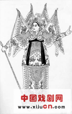 男式靠在使用时插靠旗,即表示人物全副武装,已处于临战状态,这叫“硬靠”(靠旗之生活依据,源于古代将官之令旗。当然,那种实用令旗较小,传令时手执,骑马行进时就插在后腰革带上,作为传令凭证。发展为“靠旗”后,已美化、夸张、加大成为临战武将的装饰物了。一般用四面靠旗,缎料,绣“单龙戏珠”)。靠的结构很复杂,全身共有绣片31块,其中有3块可移作它用。穿蟒或穿箭衣者围靠领,象征武将;单用两块靠腿者,象征丢盔卸甲的败将,具有符号意义。
