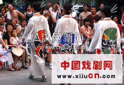 昨晚,武昌徐东新世纪社区,居民们身着绘有京剧脸谱的服饰进行表演。当日,徐家棚街新世纪社区组织了一场别开生面的京剧纳凉晚会,数百名居民在习习凉风中唱京剧、看武戏、赏服饰,体验国粹京剧的魅力。 记者史伟 摄影报道