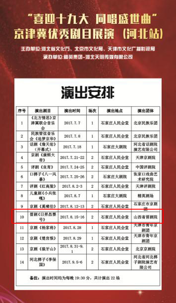 为迎接党的十九大胜利召开,山西省晋剧院创排的国家艺术基金2016年度资助项目晋剧《日昇昌票号》将于2017年8月15、16日晚,在河北省石家庄人民会堂上演。这是该剧参加由河北省文化厅、北京市文化局、天津市文化广播影视局主办的“喜迎十九大 同唱盛世曲”-----京津冀优秀剧目展演(河北站)演出。