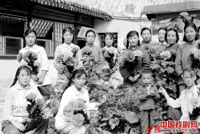 图二:1959年夏,原平晋剧团组成鲜花队,准备给工农业生产“大跃进”中的劳模鲜花。图中后排站立者右二为筱玉凤。