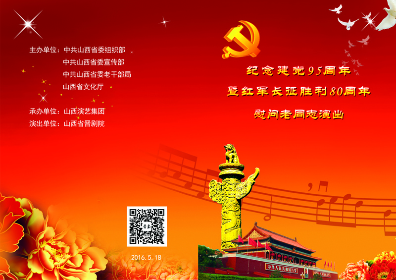 2016年5月18日晚,由中共山西省委组织部、中共山西省委宣传部、中共山西省委老干部局、山西省文化厅主办,山西省晋剧院演出的纪念中国共产党建党95周年暨红军长征胜利80周年慰问老同志演出活动,在太原市青年宫演艺中心上演。观看演出的省级老领导有:刘泽民、纪馨芳、张邦应、李玉明、阎元锁、光敏、白陞、赵耀仁、左祥等。省委宣传部、省文化厅、省委老干部局领导同志及省直机关离退休老同志等1000多人到场观看演出。
