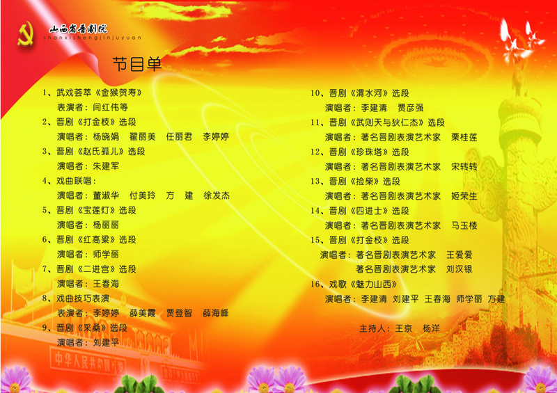 演出晚会由山西省晋剧院的晋剧老中青三代名家云集,传统剧、现代剧、新编剧名段荟萃,演出在我院一批青年演员武技绝活《金猴贺寿》中拉开了序幕,精湛的表演赢得观众阵阵喝彩。《红高粱》《宝莲灯》《打金枝》《赵氏孤儿》《采桑》《渭水河》《二进宫》《武则天》《珍珠塔》《四进士》《捡柴》等经典名段纷纷上演。老中青三代晋剧表演艺术家同台献艺,演员阵容强大,有多名“梅花奖”“杏花奖”获得者。整台晚会演出风采多呈,为老同志们献上一道丰盛的晋剧盛宴。