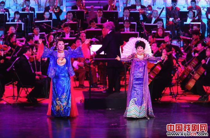 舞台上前面是爱乐交响乐队和晋剧团戏曲乐队,后面是身着华美的戏装的合唱队,是个超过百人的豪华阵容。演出在欢快热烈的音乐声中开始了,第一个出场的青衣名旦刘建平一亮相开唱,就让我们感到了眼前一亮,她和另一位唱须生的名家李建青联袂演唱的《千秋梨园情》,充分展现了晋剧艺术的优秀传统与创新精神。