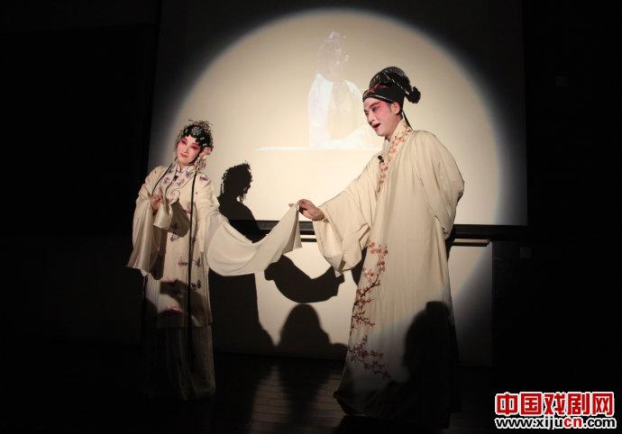 玖林,小生,在香港找的他,都是苏州昆剧院的同学,有了男主角了差个女主角,后来我就到苏州去选美,她们就扮起来,她就扮杜丽娘给我看,这个苏州姑娘很像,大家注意她的眼神,眼角留情很有味道。刚好她跟俞玖林配起来演青春版《牡丹亭》,从2004年开始演,到去年演了200场,他们演得很受欢迎,到过29个大学去演过,他们是大学里面的偶像。请他们唱一段《游园》,我们的园子(讲台)很小,只有这么一点,但昆曲很厉害,无论舞台大小都可以演出来。