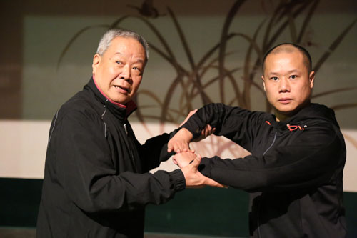演出间隙,蔡正仁(中)页不忘帮弟子罗艳和雷玲抠戏