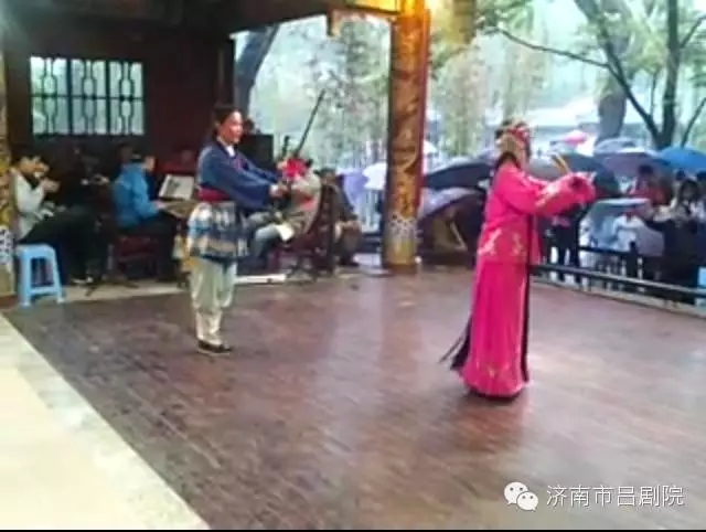 16日上午,在趵突泉公园并未因天气影响演出。在淅沥的春雨中,剧院为前来冒雨观看的游客们献上《王小赶脚》、《搬窑》两出小戏,为雨中的公园更添一分景致。