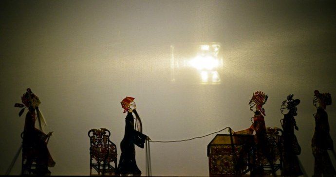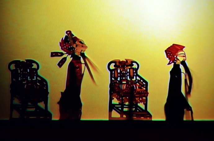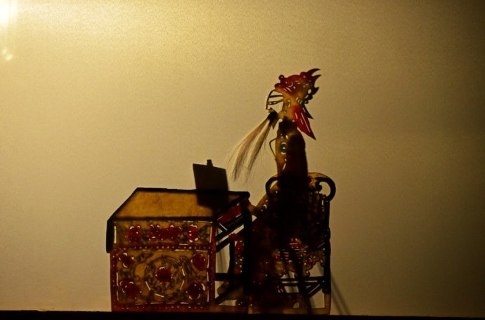 “借灯显影,配声以演故事”,锣鼓敲起戏开场,虽然“药王孙思邈”是大家熟知的故事,可编导者们独具匠心的把他和通渭大地、尖岗山、通渭温泉联系起来,原来药王孙思邈和通渭大地有这么多的渊源,我却是第一次看到。幕帐后面的艺人杨永忠一边操纵皮影人物,一边演唱,时而高亢粗犷,时而悠扬婉转,在杨永忠的手中,皮影人物都是那样听话、活跃,它们跑场、翻转、武打、提袍、甩袖、吹胡子、摇翅等舞台动作,将戏中各种人物故事表演得淋漓尽致、扣人心弦,具有强烈的艺术感染力。我最喜欢影子腔中,当在唱腔末句或高潮时,一人唱,众人和,大气,很有穿透力,渲染气氛、加强效果,确实是影子腔特有的艺术风格。