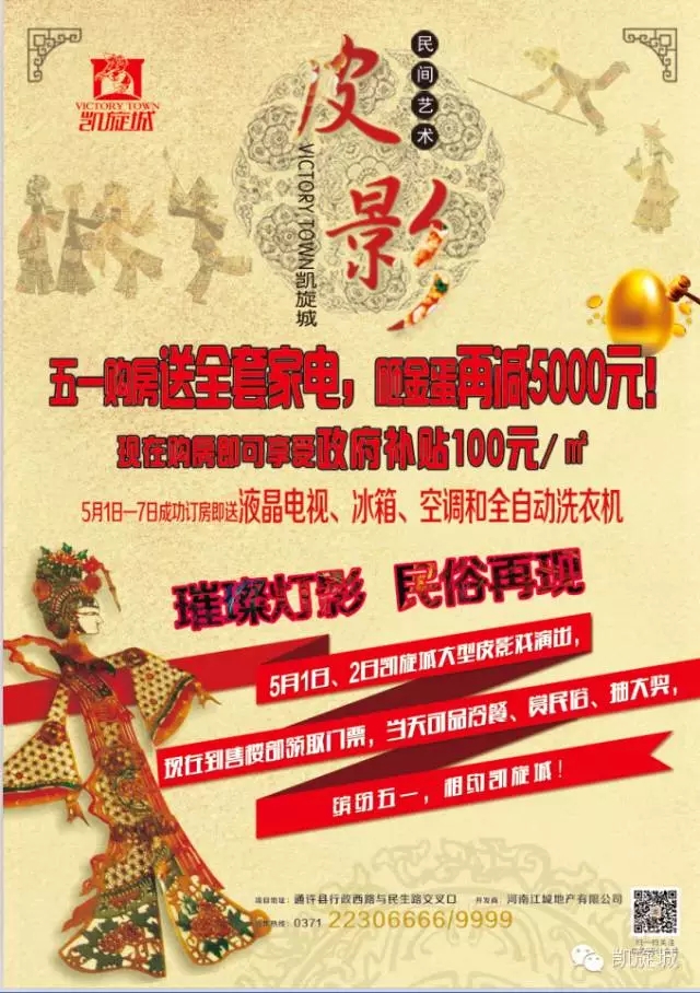 作为非物质文化遗产之一的皮影戏,历经几经兴衰,如今却濒临消失之势,为了弘扬我国皮影文化,使大家近距离了解并接触到这份美好,5月1日、2日,凯旋城特邀专业皮影戏老艺人组成的剧团,为大家带来一场惊艳冬日的视觉盛宴:《武松打虎》、《大闹天宫》、《三打白骨精》、《白蛇传》等精彩皮影戏,低吟浅唱间,串起岁月长河里散落了的记忆碎片,现在到售楼部就可免费领取门票,当天凭门票还可参加抽奖活动,凯旋城还精心准备了各种水果糕点,让你这个假期看得开心吃得开心,过足瘾!