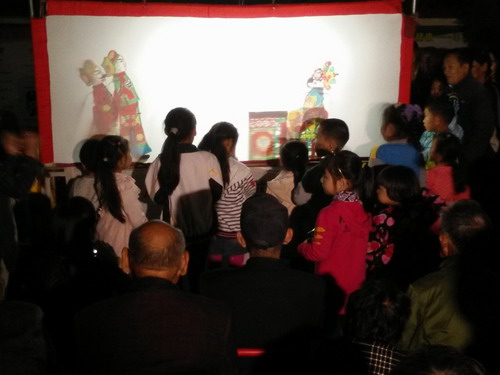 当天晚上6点50分,锣鼓齐鸣,皮影戏《薛丁山征西》正式开演,居民们纷纷地围坐了过来。