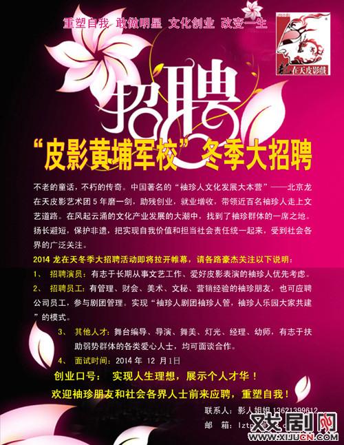 北京龙在天皮影团冬季招聘启动,欢迎朋友尽快联系我们,身体健康面试合格免费培训管吃住袖珍人免交费用。有乐器、编导、舞美、主持、设计、管理,经理,讲解员等。面谈合作。面试时间:12月1日。联系王主任15810133415,01062618506地址:北京海淀区圆明园南门站东100米。