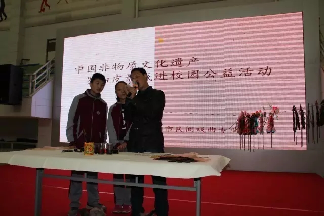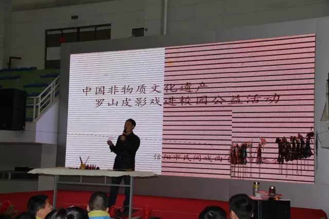 李世宏老师就罗山皮影戏的由来、罗山皮影戏的传承和保护、罗山皮影戏常用人物方面的基本知识三个方面给学生们做了精彩的演讲并现场演绎了一段罗山皮影戏。