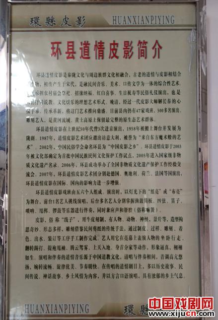 甘肃环县古称环州,它是正宗陇东道情的故乡,是代表甘肃省独特剧种--"陇剧"的诞生地。陇东道情的精髓正是别具地方艺术特色的环县"道情"。它与牛皮灯影相互结合,美妙绝伦,相得益彰。成为戏坛曲苑中一枝独秀的奇葩。道情皮影戏的人物和道具全部用牛皮做成,人物则成侧面形象,由许多小片组合而成,其道具有桌椅、宫殿、城门、车船、桥、马、虎、龙等。该剧种目前已极为罕见,只有几个老艺人会表演,被称为戏剧"活化石"。甘肃环县古称环州,它是正宗陇东道情的故乡,是代表甘肃省独特剧种--"陇剧"的诞生地。陇东道情的精髓正是别具地方艺术特色的环县"道情"。它与牛皮灯影相互结合,美妙绝伦,相得益彰。成为戏坛曲苑中一枝独秀的奇葩。