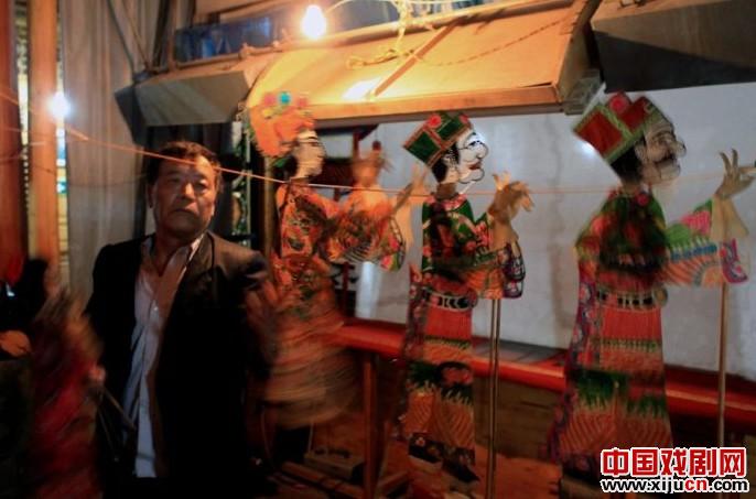 我看到那个中年女子拿着演出道具出了后门,我想,说不定在旁边的饭馆也要演呢。因为刚才经过旁边的饭店时,我看到其院子里也有一个皮影戏台,我尾随而去。果不其然,刚才那位老爷子已经在忙着将地上木箱里的道具取出,悬挂在绳子上。我插空向老先生说:“您是刘家庄的吗?”“不是,是刘家寨。”他答到。“对对,我记错了,是刘家寨,云南仅存的皮影保留地。”老人听后不由得抬起头看着我,仿佛在问,你怎么知道?我说:“来腾冲之前,我查看了有关资料。”