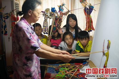 7月9日,孩子们近距离观摩“皮影”幕后的场景。