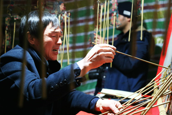 按照剧情前后需要,罗隆军要把皮影按照一定的顺序摆设好。
