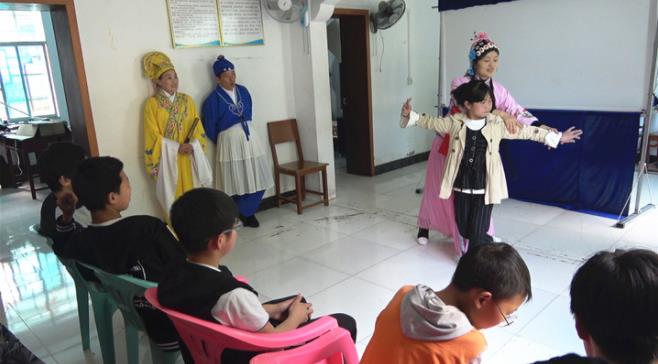 讲解戏曲专业知识,示范演唱,手把手地传授花旦、小生、小丑等角色的表演技能,孩子们饶有兴趣,学得有模有样。