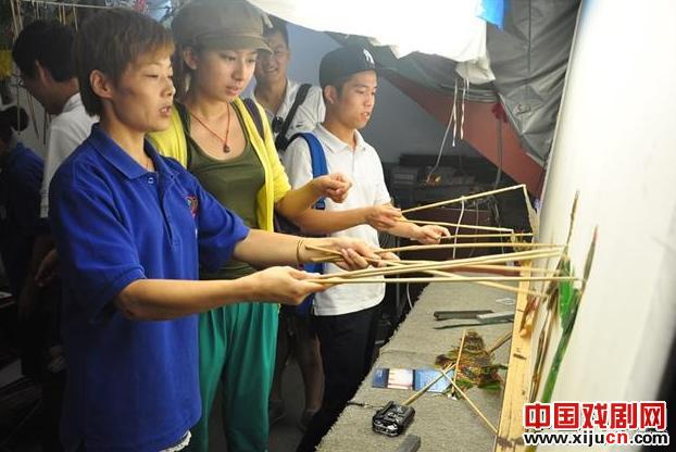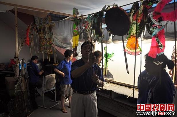 转到后台可以看到,有五位老师傅在操作着这些皮影人物。在“水漫金山”的最后一幕镜头中,九个皮偶人物同台出现,后台则有五位师傅一起上下翻飞地操作着这九个皮偶。他们动作娴熟,尽管人物多,道具多,操作线更多,甚至需要交错进行操作,但却有序而动,丝毫不乱。