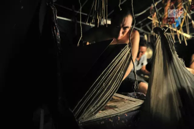 孙伟四岁时就开始跟着爷爷学习皮影了。2014年,孙伟来到一家演艺公司工作,专门为外地游客表演皮影。图为演出时的孙伟,由于幕布不透风,坐在一千多瓦的电弧灯后,尽管光着背,还是会汗流如注。