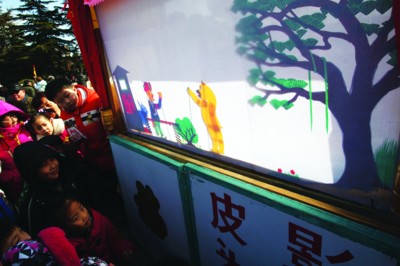 在烟台毓璜顶公园,刘正中老人为市民表演皮影戏《光头强当上护林员》。只见老人怡然自得地晃着脑袋,哼唱着戏文,随着音乐击鼓敲锣,双手舞动着皮影道具,忙而不乱。