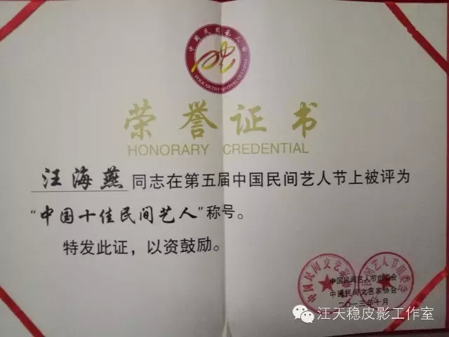 2015年受邀参加杭州西泠印社主办的《汪氏皮影作品展》及相关论坛,其作品《门神》被主办方收藏。