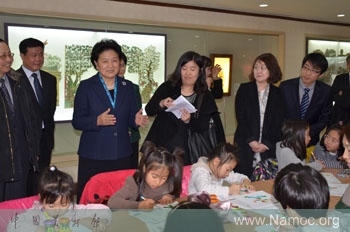 2月24日,布置一新的首尔中国文化中心洋溢着新春的喜庆气氛。当地时间11时许,作为胡锦涛主席、习近平总书记特别代表参加韩国新任总统朴槿惠就职仪式的中共中央政治局委员、国务委员刘延东一行来到展厅,兴致勃勃地参观了展览。刘国委仔细观看了每一件作品,认真听取了介绍,并对这种积极弘扬中国传统文化、深化中韩两国文化交流和相互了解的做法予以充分肯定。在展厅中央的儿童活动区,见到一群韩国小朋友们正在对照展出的作品认真学画中国皮影,刘国委高兴的走到孩子们身边,热情的交流,孩子们用中文向她问好。刘国委指出,文化交流是拉近两国人民友谊的重要纽带,而巩固和发展两国友谊的任务寄托在年轻的下一代,希望他们今后能够为中韩友好关系做出贡献,并祝愿各位家长和小朋友们蛇年大吉,元宵节愉快。教育部部长袁贵仁、中国驻韩国大使张鑫森、国务院副秘书长江小涓、外交部副部长崔天凯等陪同参观。