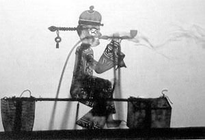 老汉抽烟的特技效果就是用一根细管对着烟管吹烟