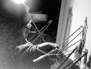 皮影戏班每人随身带一两件乐器,如板胡、二胡、笛、钹、鼓、锣等,每到一处,就用两根棍子把一块白纱布(也叫银幕)一撑,挂一只汽灯,再放一两张桌子、几条长凳,皮影戏的舞台就搭好了。