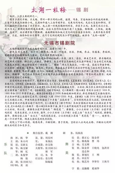锡剧,江苏主要剧种之一。萌芽于清代中期,系无锡、常州一带乡间的山歌、道情、唱春、宣卷相融合而形成的滩簧,后逐步发展成为摊簧小戏,民国初年进入上海等城市后,发展为同场戏;先后从宝卷和弹词、京剧和徽剧中引进移植了许多剧目,也上演一些现实题材的时装、清装乡土戏;表演艺术以小生、花旦为主;簧调是锡剧的基本曲调,以后又创作和改编引进了大陆板、铃铃调、三角板、迷魂调、高拨子、南方调等数十种曲调,属曲牌联结和板式变化的综合性音乐体制,主要伴奏乐器有二胡、琵琶、笛子和打击乐器等。流行于太湖流域及长江中下游地区,被誉为“太湖一枝梅”。