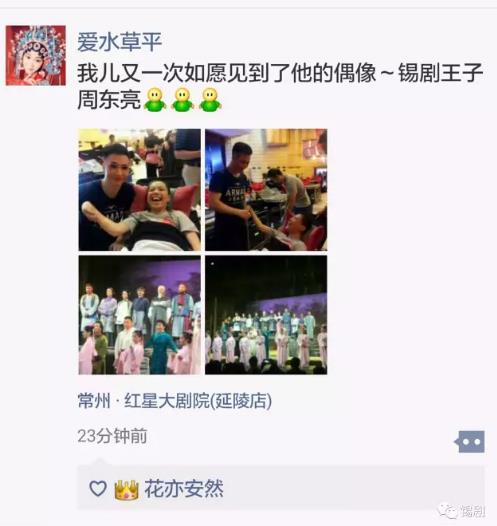据悉他在生下来三个月发现是脑瘫,如今已经19岁了。他从小酷爱戏曲,尤其钟爱地方戏锡剧,虽然身残但对于锡剧的爱好丝毫不逊色于任何人,在众多锡剧名家当中尤其对有着锡剧王子美称的江苏省锡剧团团长周东亮情有独钟,每次只要有周团长的戏在常州演出,总会让爸妈陪着他去演出现场观看,每当看到周东亮上场总会激动不已,可谓是锡剧王子的忠实的粉丝!每次演出完毕他总是迟迟不肯离开,最大的心愿就是能够和自己喜爱的王子合影留念!然后让爸妈把照片装裱挂在自己的卧室,平时也是从早到晚一遍又一遍的听周东亮的锡剧唱段,对于锡剧的爱好已经达到痴迷的程度,徐泽彬的爸妈说:孩子可以一天不吃饭,但是不可以一天不听戏!今天非常幸运的再次和王子合影,高兴得合不拢嘴!