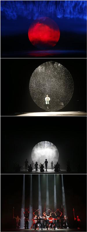 具有传奇性且色彩丰富的神话戏题材,对于所有剧种来说都是难点,无论是剧院还是演员,想要驾驭都有一定难度。导演韩剑英表示,《素女与魃》舞台呈现将观众带回“远古战场”,打开全新的越剧视野,“全剧从舞美、服装、造型和音乐上,都大力营造出远古神话的舞台氛围,呈现出中国式歌剧特点和传统戏曲元素融合的整体风格。”舞美以先秦古籍《山海经》为灵感之源,通过舞台装置呈现出山川、湖海、宇宙等“山海经”式的自然世界,“尽可能减少人为痕迹,多增添一些天然的纯朴,打造出中华神话世界的奇谲瑰丽、丰富多姿。”基于对神话世界的大胆想象,《素女与魃》打破原有镜框式舞台的习惯性空间定位,借鉴“全息”理念,后方架设高台,前方铺设转台,利用舞台纵深呈现不同时空的切换。为了展现上古众神各有司属,在众神群像场面调度中,角色站位呈现散点式,通过错落感超越了单一空架构,以呈现以一个当代人视角为出发点的神话世界。不少角色服装肩部加高,隐约可见歌剧痕迹,也能展现远古战争题材的硬朗感。