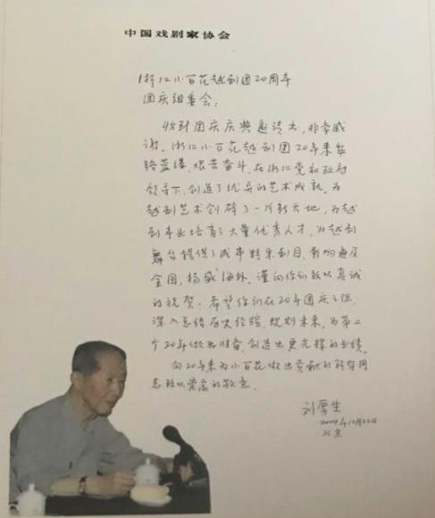 小百花20周年生日,刘厚生专门写了一封贺信,一篇文章《开展艺术竞争,扩大越剧影响——祝贺浙江小百花越剧团20华诞》,刊登在小百花的团刊上。