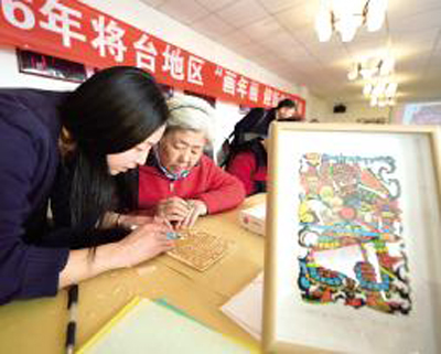 美院学生教居民做年画1月28日,来自中央美院版画系的大学生们来到将台文化中心,现场教居民如何制作木版年画。木版年画是中国历史悠久的汉族传统艺术形式,有着一千多年的历史。如今,年画已不仅是节日的装饰品,它所具有的文化价值和艺术价值,使它成为反映汉族民俗社会文化生活的百科全书。