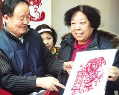 民俗艺人为望京居民剪窗花剪纸不仅需要手巧,更需要创意。剪纸社成员们在今年央视推出的吉祥物“康康”的基础上,还加上了一些颇具创意的小细节,甚至还为小猴子设计了不同“性别”,“女孩”猴子的耳朵上甚至还还缀上了一副别致的耳环。一上午,剪纸社的成员们就创作出了20多种姿态不同、风格各异的小猴子形象,为居民送上了上百幅剪纸作品。