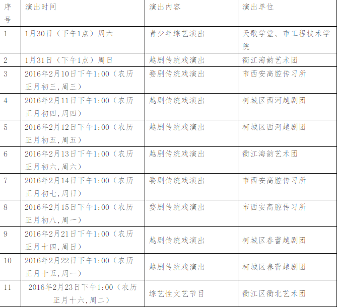 家里老一辈的人都喜欢看戏、听戏,房里的电视机常年锁定央视戏剧频道,散步的时候还有睡觉前,都会抱着收音机听戏。过年了,喜欢看戏的老年人有福了,这里有个活动让戏剧不再停留在电视上和收音机里,你可以带着长辈们到现场去听场戏!2016年起,衢州市文化志愿者联合会将大力弘扬志愿服务精神,展示文化志愿者风采,吸引更多的社会群体和个人参与到文化志愿服务中来,享受文化、参与文化、创造文化,在天妃宫开展贯穿全年的文艺演出活动,形式多样,内容丰富,包括折子戏、古装戏、现代戏专场演出及票友活动;器乐、歌舞、流行音乐、曲艺等专场及综艺演出;非遗保护项目的展示展演;各门类文艺展示及沙龙活动,全面打造我市文化志愿者服务品牌。根据衢州市文化志愿者联合会近期的活动安排,春节期间天妃宫演出活动安排如下: