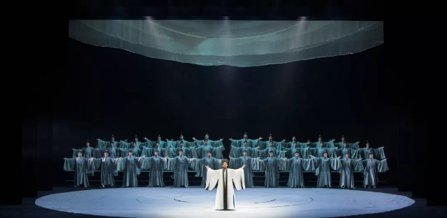 此次《王阳明》的舞台呈现却体现出不同,视觉意识相当鲜明而自觉。多场次均以纱幕分割,最多时32位演员分前、中、后三个表演区域站立,辅以灯光语言,用意营造简约与恢弘并存的舞台气象,通过视觉传达把观众带入心学的玄妙之境。全剧整体舞美删繁就简,却不走一桌二椅路子,而是用32人同台的造型感来弥补“简”所无法传达的宏阔感。这些完全是现代戏曲舞台形态的探索和推进。