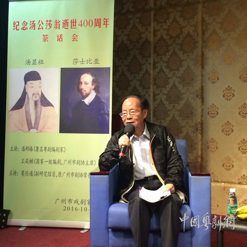 今年10月21日,值2016年广州戏剧文化年之际,广州市戏剧家协会举行了“纪念戏剧大师汤显祖(汤公)、莎士比亚(莎翁)逝世400周年”座谈会。广州市剧协副主席崔克勤、何伟超、秘书长郭英伟、广州文学艺术创作研究院书记(粤剧中国保护中心主任)陈刚、剧协主席团部分成员和会员以及戏剧界人士和新闻记者等80多人参加了座谈会。