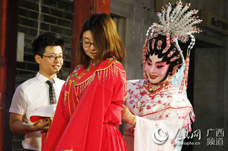 6月28日晚,“砥砺奋进60载——2018境外媒体看广西”采访团第三组成员走进广西梧州骑楼城,参观夜幕下的骑楼街道,观看民间自发组织的梧州粤剧表演,并穿上粤剧戏服,学习粤剧经典身段,演绎一段“洋”粤剧。