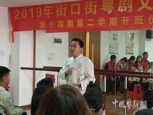 小红豆艺术团艺术总监黄捷芬老师介绍本学期的培训计划,每星期的星期天进行培训学习,按基础班、初级班、表演班编排,其中基础班学习粤剧基本功,包括台步身段功等;初级班学习粤韵操、粤曲演唱等;表演班学习粤剧经典剧目折子戏排演等。
