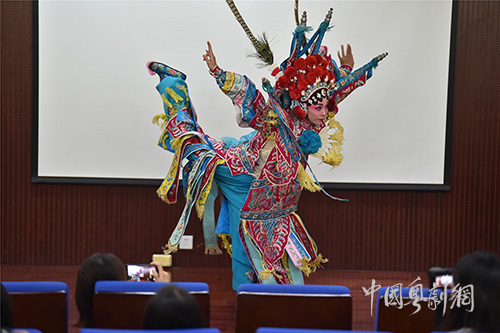蒋文端带着我院的优秀青年演员们多维度地向留学生们展示旦角的魅力。按照年龄分类从天真活泼的“小旦”;未出阁的大家闺秀“闺门旦”;端庄稳重的中年妇女“青衣”;年迈的妇人“老旦”,还有扮演滑稽或奸刁的女性人物“彩旦”;江湖女侠、身怀绝技的“武旦”;能唱能打的女元帅或女将“刀马旦”。
