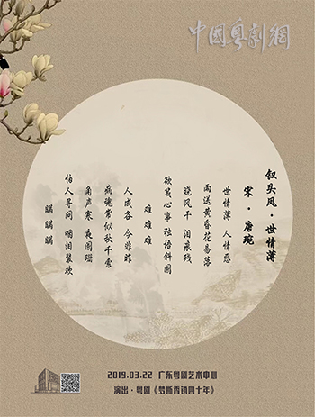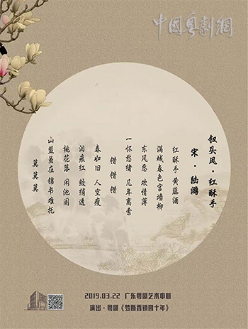 2019年3月22日 广东粤剧艺术中心 《梦断香销四十年》 主演:郭建华 杨静 编剧:陈冠卿 导演:陈酉名、李燕清 简介: 剧中大量运用了南宋诗人陆游、唐琬的诗词:
