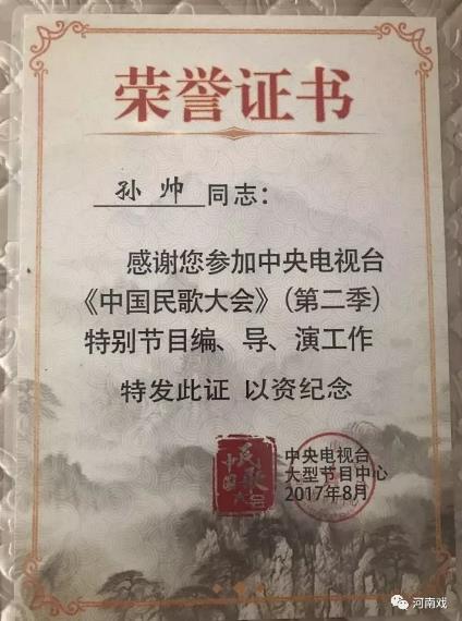 中国民歌大会》第二季筹备伊始,节目组就向孙帅发出了邀请,带着郑州市公安局党委、政治部的嘱托,孙帅一人北上,参与节目,并在节目中留下了郑州公安人良好的队伍形象。